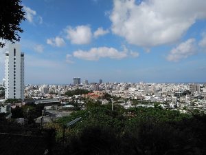 国際通り、沖映通りを抜けて若狭海岸へ。10mを越えるであろう龍柱を眺めながら若狭緑地へ到着。近くで見るとけっこう大きい。が、どうも目立ちません。周辺の高さのある雑多なものに紛れている感じがします。電線、電柱の地中化をしたらもう少し目立つでしょうか。